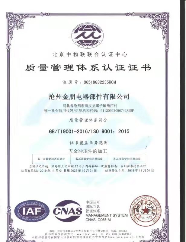 沧州金朋电器部件有限公司,位于素有中国“五金之乡”美誉的河北沧州市南皮县,北靠北京、天津,东临渤海黄骅港,南邻山东,距京沪铁路5公里,京沪高速南皮出口6公里,紧挨104国道、武千线、沧宁公路,地理位置优越,交通十分便利。
